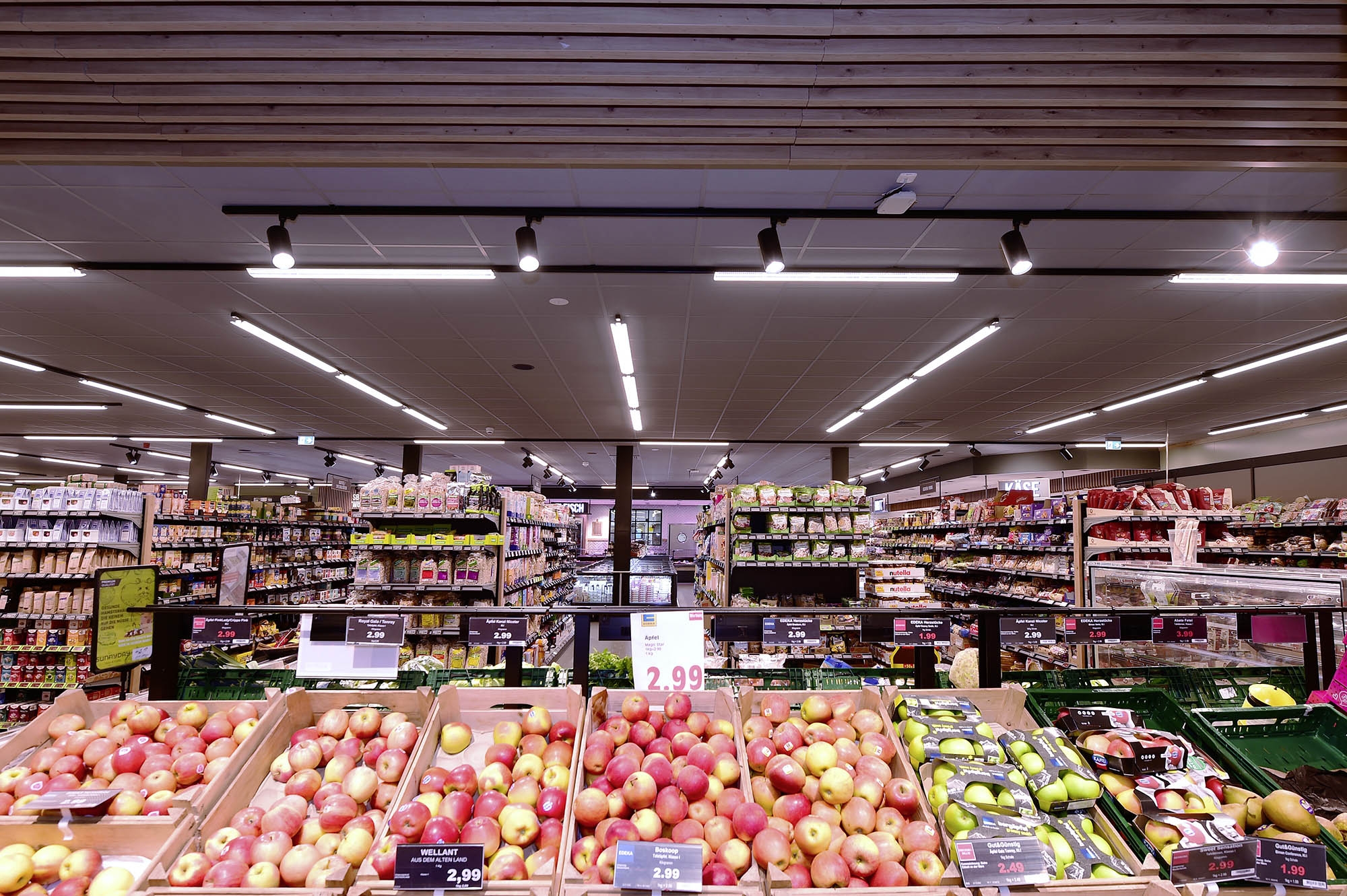 Die LINEAR PRO FOLD 3-Phasen Stromschienenleuchte ist die ideale Lösung für die Beleuchtung von Verkaufsregalen. Durch ihre spezielle Optik eignet sie sich hervorragend für die Beleuchtung von Regalgängen. Damit ist sie in der Lage, typische Anwendungsszenarien auf beiden Seiten des Ganges über die gesamte Höhe gleichmäßig auszuleuchten. Gleichzeitig sorgt der diffuse Lichteinsatz in der Mitte für eine gleichmäßige Ausleuchtung des Ganges selbst.